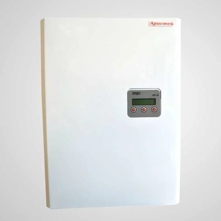 Электрический котел ЭРДО ЭВПМ-18А серия "Аристей" предназначен для водяного отопления зданий, имеющих закрытую отопительную систему, работающую при давлении не более 0,2 МПа (20 м водяного столба) при напряжении трехфазной сети 380 в. Водонагреватель может использоваться автономно или совместно с отопительными котлами, работающими на твердом топливе или газе. Водонагреватели изготавливаются климатического исполнения УХЛ4 по ТУ 3468-006-56364010-2010 и предназначены для эксплуатации в отапливаемых помещениях с невзрывоопасной средой при температуре окружающего воздуха от +1°С до + 35°С и относительной влажности воздуха не более 80% при температуре 25 °С. Водонагреватель оснащѐн встраиваемым блоком управления с микроконтроллером и жидкокристаллическим индикатором, предназначенным для регулирования температуры теплоносителя электроводонагревателя и температуры воздуха отапливаемого помещения, заданных пользователем.
