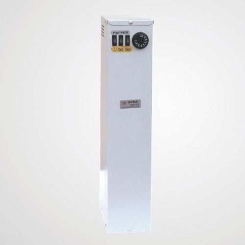 Электрический котел ЭРДО ЭВПМ-24 предназначен для водяного отопления зданий, имеющих открытую или закрытую отопительную систему, работающую при давлении не более 0,2 МПа (20 м водяного столба) при напряжении трёхфазной сети 380В или однофазной сети 220В. Электрокотлы могут использоваться в качестве основного или резервного источника теплоснабжения. Они не нуждаются в постоянном обслуживании, экологически безвредны и безопасны. Электроводонагреватель состоит из корпуса, стальной ёмкости, пульта управления, закреплённого внутри корпуса. В верхней части ёмкости, во фланце, смонтированы трубчатые электронагреватели. Элeктрoкoтёл имеет встроенный пульт управления, предназначенный для переключения мощности и регулирования температуры нагрева теплоносителя. Регулятором температуры элeктрoкoтла служит капиллярный термостат, термочувствительный элемент которого закреплён в средней части стальной ёмкости (резервуара). В котле имеется колодка для подключения циркуляционного насоса. Его включение (если он подключен к водонагревателю) производится клавишей, расположенной на лицевой панели водонагревателя. Для защиты от перегрева электроводонагреватель оборудован самовозвратным датчиком аварийного отключения (температура срабатывания 90†5 оС). Верхний напорный и нижний обратный патрубки предназначены для присоединения водонагревателя к системе отопления. На лицевой стороне водонагревателя расположена ручка регулятора температуры и клавиши переключения мощности. На задней части корпуса имеется сальник для ввода в пульт питающего кабеля и болт для крепления заземляющего провода. ЭВПМ-24 оснащён колодкой для подключения выносного комнатного терморегулятора.