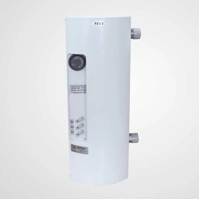 Электрический котел ЭРДО ЭВПМ-NEXT-6 предназначен для водяного отопления зданий, имеющих открытую или закрытую отопительную систему, работающую при давлении не более 0,2 МПа (20 м водяного столба) при напряжении трёхфазной сети 380В или однофазной сети 220В. Электрокотлы могут использоваться в качестве основного или резервного источника теплоснабжения.Они не нуждаются в постоянном обслуживании, экологически безвредны и безопасны. Электроводонагреватель состоит из корпуса, стальной ёмкости, пульта управления, закреплённого внутри корпуса. В верхней части ёмкости, во фланце, смонтированы трубчатые электронагреватели. Элeктрoкoтёл имеет встроенный пульт управления, предназначенный для переключения мощности и регулирования температуры нагрева теплоносителя. Регулятором температуры элeктрoкoтла служит капиллярный термостат, термочувствительный элемент которого закреплён в средней части стальной ёмкости (резервуара). Для защиты от перегрева электроводонагреватель оборудован самовозвратным датчиком аварийного отключения (температура срабатывания 90†5 оС). Верхний напорный и нижний обратный патрубки предназначены для присоединения водонагревателя к системе отопления. В электрокотлах ЭВПМ-NEXT реализована возможность изменения расположения патрубков подачи и обратки относительно лицевой панели при монтаже изделия. На лицевой стороне водонагревателя расположена ручка регулятора температуры и клавиши переключения мощности. На нижней части корпуса имеется заглушка ступенчатая для ввода в пульт питающего кабеля. Болт для крепления заземляющего провода расположен внутри корпуса на кронштейне крепления колбы котла.