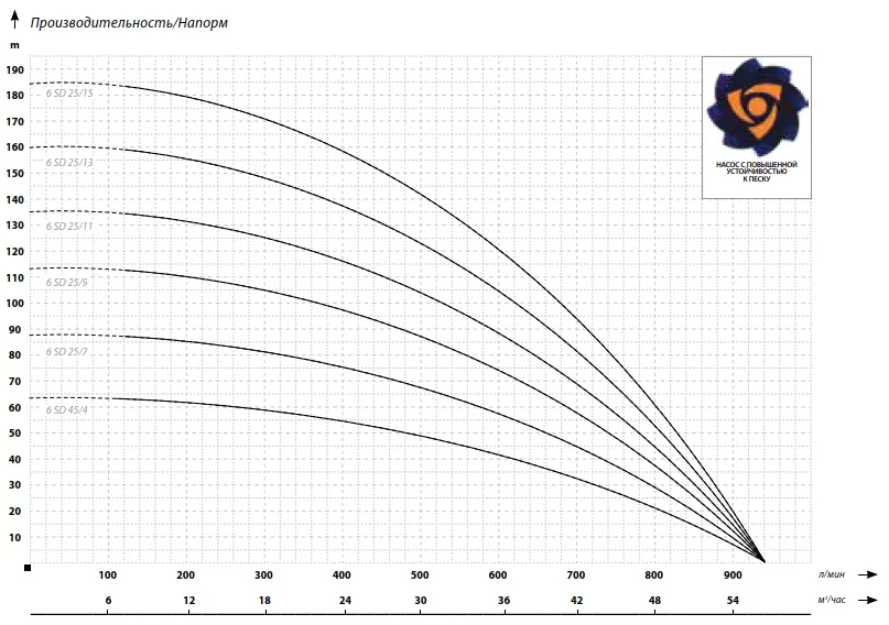 Трехфазный скважинный погружной насос IBO 6SD 25/13 диаметром 146 мм с повышенной устойчивостью к песку. Насос IBO 6SD 25/13 доступен к покупке с двигателями IBO и итальянскими двигателями IBO ITALY. В насосе IBO 6SD 25/13 используется технология «плавающих лопастных колес», а также для основных рабочих элементов насоса применяются износостойкие материалы: латунный нагнетательный патрубок, корпус, вал и сетка фильтра выполнены из нержавеющей стали AISI 304 / а также лопастные колеса выполнены из высококачественной пластмассы, Благодаря этому насос IBO 6SD 25/13 имеет повышенную стойкость к песку. Насос комплектуется кабелем 1 м, по желанию его можно нарастить до нужного размера. Скважинный насос IBO 6SD 25/13 имеет отличные характеристики. Напор насоса в максимальной точке составляет 160 м, а производительность достигает максимального показателя в 55.2 м³/час. Мощность двигателя составляет 13000 Вт, то вполне неплохо для насоса с такими напорно-расходными характеристиками. Насосы серии SD марки ИБО были первыми насосами на рынке, названными «анти–песочными». Они по прежнему являются одними из немногих скважинных насосов на рынке, которые имеют конструкции с такой высокой устойчивостью к песку. Максимальное содержание песка в воде – до 5%. Насос IBO 6SD 25/13 можно применять как аналог насосов ЭЦВ.