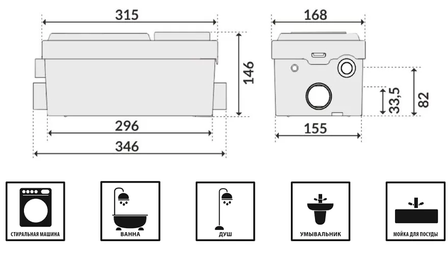 Насос подобен мини–насосной станции Sanibo, благодаря переключателю он является полностью автоматическим устройством, предназначенным для использования в ванных комнатах для слива воды из раковины, душевой кабины или кухни из стиральной машины или раковины. Идеально подходит для ванных комнат, где раковина или душевой поддон расположены за пределами стояка канализационного коллектора или ниже