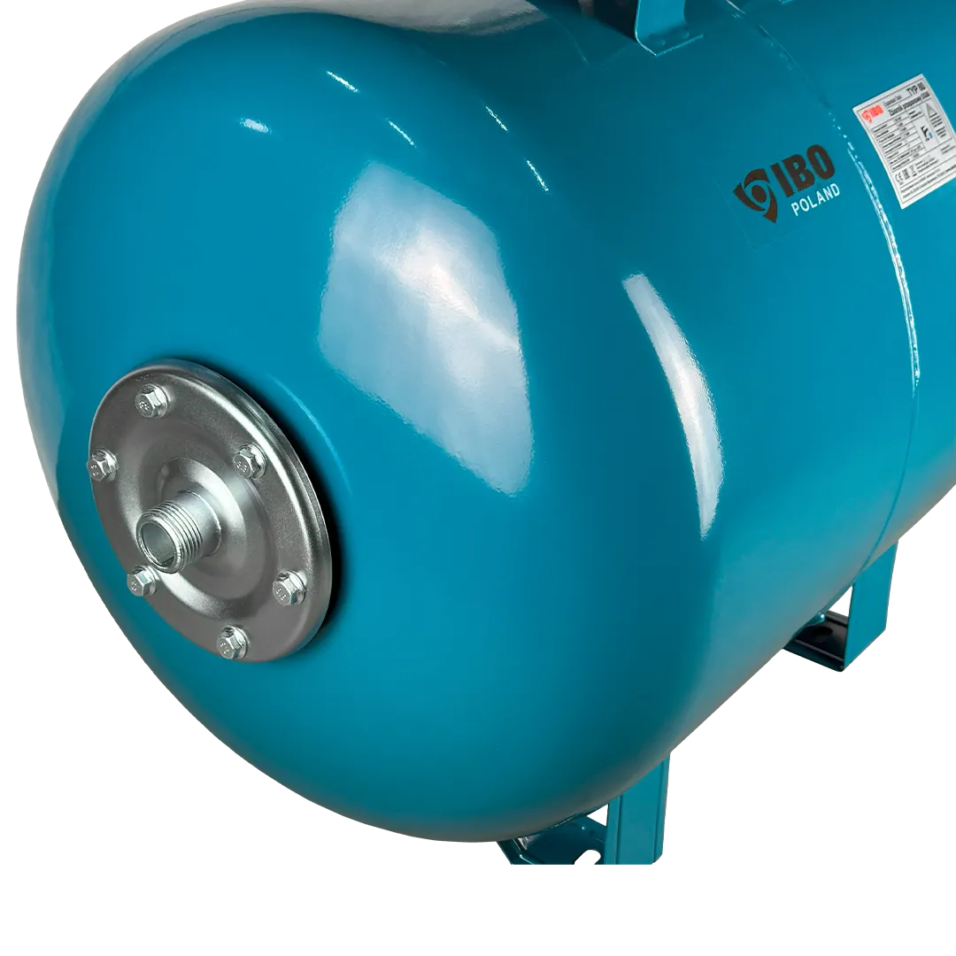 Горизонтальный мембранный бак для воды IBO объемом 80 литров. Бак выполнен из стали и покрыт специальным антикоррозионным составом. Мембрана бака выполнена из пищевой резины на основе бутилкаучука. Бак снабжен приварной площадкой для установки поверхностного насоса. В нижней части бака установлены металлические кронштейны с целью крепления бака к поверхности.