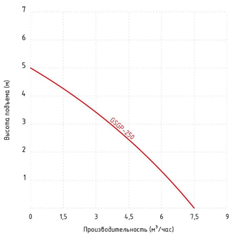 Технические характеристики дренажного насоса JEMIX GSGP-250 включают мощность 250 Вт, максимальную производительность до 7,5 м³/час, максимальный подъем до 5 метров, подключение шланг/труба 1, 1¼, 1½ дюйма, максимальную глубину погружения до 3 метров, напряжение 220 В, 50 Гц, длину сетевого кабеля 6 метров, максимальную температуру воды +40°С, объем упаковки 0,014 м³, вес 2,25 кг и гарантию на 12 месяцев*.