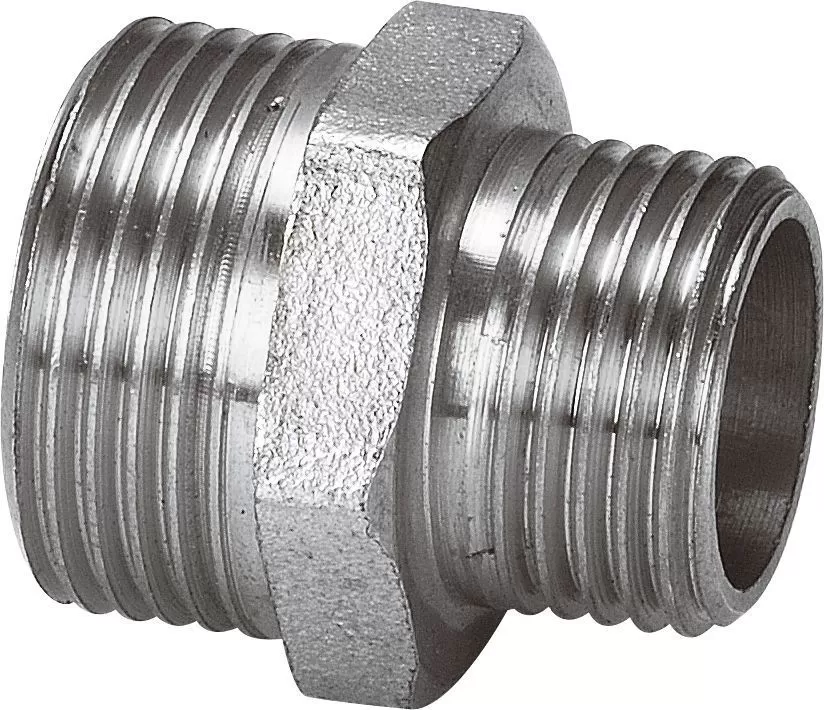 Ниппель переходной AQUALINK 1"М х 1 1/4"М – специальный соединительный элемент, цилиндр, на два конца которого снаружи нанесена резьба, что предусматривает монтирование системы путем вкручивания, используются для создания разъемных резьбовых соединений на трубопроводах холодного питьевого, хозяйственного и горячего водоснабжения, отопления, сжатого воздуха и на технологических трубопроводах, транспортирующих газы и жидкости, неагрессивные к материалу соединителей. Посередине данной конструкции для удобства присоединения предусмотрена шестигранная гайка, поэтому монтаж легко можно осуществить с помощью обычного гаечного ключа. Резьбовое присоединение ниппелей характерно для соединения в тех местах, где предусмотрена неоднократная разборка конструкции или же исключена работа с открытым пламенем. Применяется для соединения деталей трубопроводов с разной резьбой или для перехода с большей резьбы на меньшую.