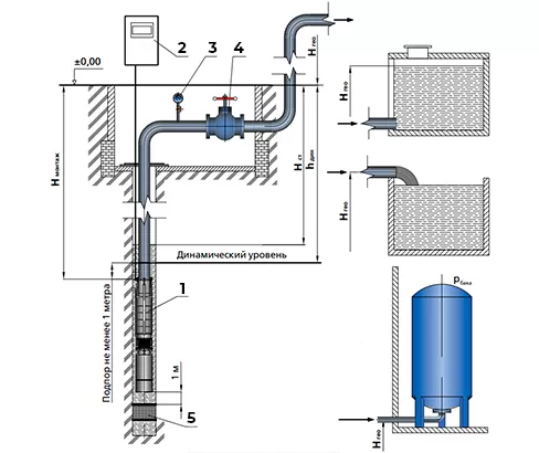Уровень установки необходимо измерять от входа в насос. Уровень установки насоса по нижнему торцу электродвигателя должен находиться не менее, чем на 1 м выше фильтра скважины, для защиты от попадания песка в насос и повышенного износа его элементов.