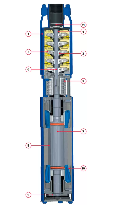 - Водозаполненный электродвигатель не требует применения специальных жидкостей и автоматически заполняется водой после установки агрегата в скважине.