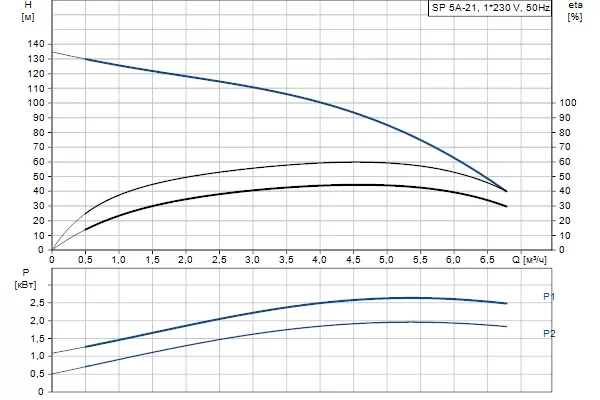 Насос Grundfos SP 5A-21 создан с применением новейших гидравлических технологий. Grundfos SP 5A-21 созданные специально для того, чтобы обеспечивать максимальную эффективность в периоды высокой нагрузки, насос имеет низкую стоимость и высокую надёжность эксплуатации вне зависимости от вида назначения. Grundfos SP 5A-21 обеспечивает высокую эффективность, высокое сопротивление абразивному износу (песку и иным абразивам), защиту от перегрева двигателя и простоту технического обслуживания. Также доступна готовая к применению система контроля и управления, предназначенная для постоянной оптимизации работы насосной системы. Максимальная производительность насоса 7 м3/час, максимальный напор 135 м при мощности электродвигателя 2200 Вт. Насос работает от сети 220 в. Гарантийный срок на насос Grundfos SP 5A-21 составляет 2 года.