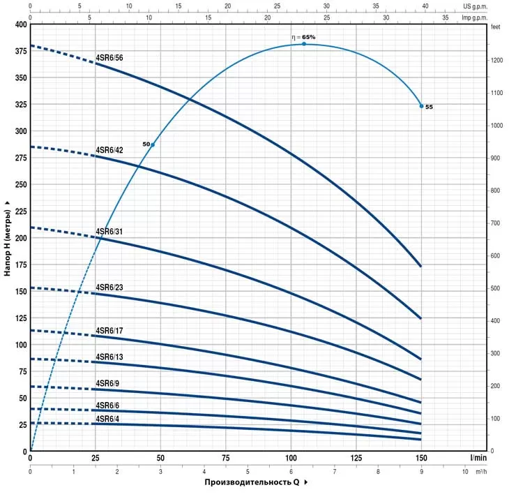 Глубинный насос Pedrollo 4SR6/42-P, отличается объективной ценой и надежной работой всех исполнительных механизмов. Насос Pedrollo 4SR6/42-P достаточно простой в эксплуатации и обслуживании, поэтому отлично подходит как для домашнего, так и промышленного применения.В основе работы Pedrollo 4SR6/42-P лежит конструктивно простой, но функционально успешный многоступенчатый центробежный принцип. Электрический двигатель подключается к агрегату через суппорт, в соответствии с нормативами международного стандарта NEMA. Мощность электродвигателя насоса составляет 5500 Вт . И при таких показателях мощности насос обладает максимальным напором в 285 метров и максимальной производительностью 9 м3/час. Функционирование Pedrollo 4SR6/42-P идентично большинству устройств, основанных на центробежных механизмах подачи воды. Жидкость втягивается в корпус устройства благодаря центробежной силе, создаваемой рабочими колесами, которые также проталкивают воду через все тело насоса "диаметр насоса 4"", а затем в нагнетающий патрубок "диаметр патрубка 2"", через который вода и попадает к конечному потребителю. Главной особенностью насоса Pedrollo 4SR6/42-P является малый диаметр корпуса агрегата, а также то, что перекачиваемая вода не касается стенок двигателя. Между жидкостью и корпусом движущей установки располагается прослойка из технологического масла, которая и предотвращает попадание мелких частиц непосредственно в исполнительный механизм. В то время как охлаждение электропривода происходит за счет верхнего способа забора воды, т.е. перекачиваемая жидкость находится всегда выше уровня расположения двигателя. Насос питается от сети в 380 в и комплектуется кабелем 1.5 метров.