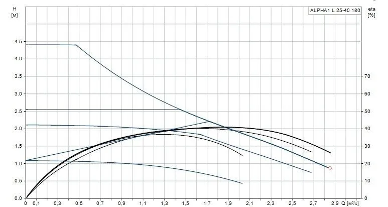 Циркуляционный насос Grundfos ALPHA1 L 25-40 используется для циркуляции воды или гликольсодержащих жидкостей в регулируемых системах отопления и в системах отопления с переменным расходом. Режим работы насоса: 3 фиксированные скорости, 2 режима постоянного давления, 2 режима пропорционально давления и режим управления по ШИМ-сигналу.