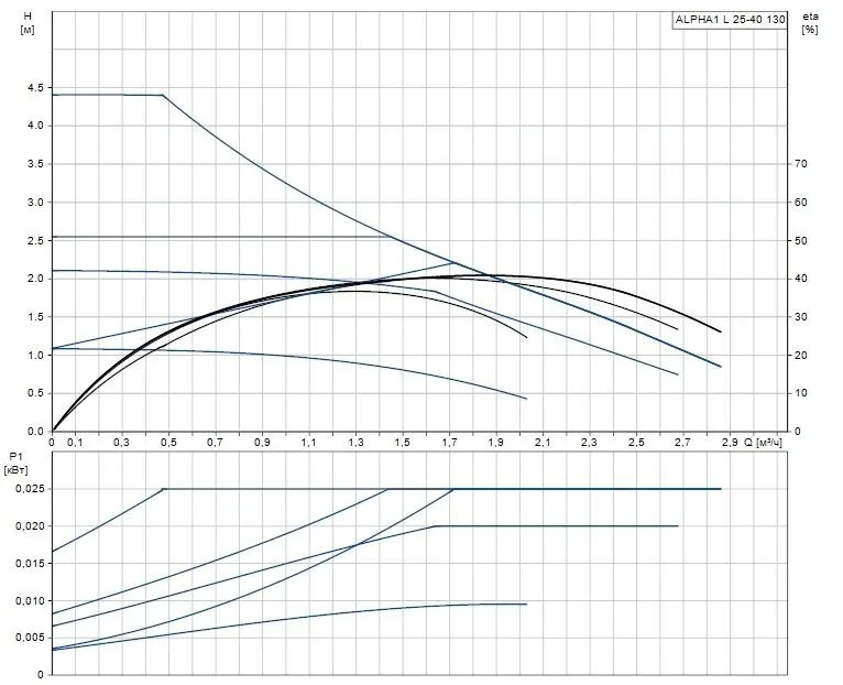 Циркуляционный насос Grundfos ALPHA1 L 25-40 130 используется для циркуляции воды или гликольсодержащих жидкостей в регулируемых системах отопления и в системах отопления с переменным расходом. Режимы работы насоса: 3 фиксированные скорости, 2 режима постоянного давления, 2 режима пропорционально давления и режим управления по ШИМ-сигналу.
