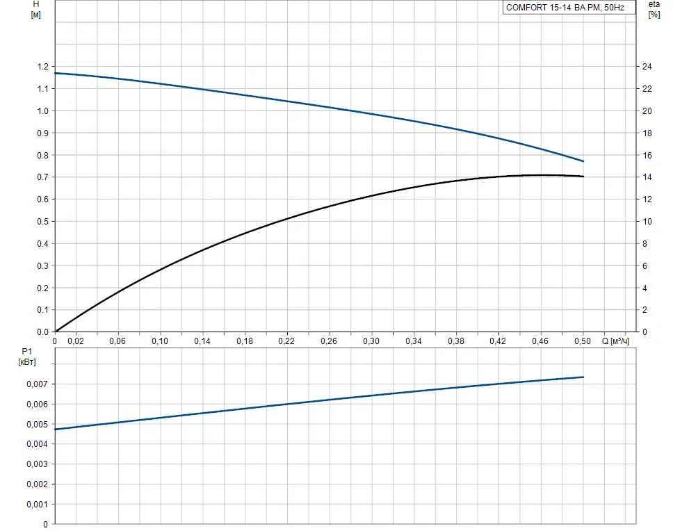 График характеристик циркуляционного насоса Grundfos COMFORT 15-14 BA PM">